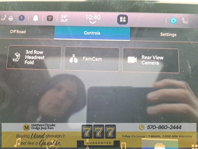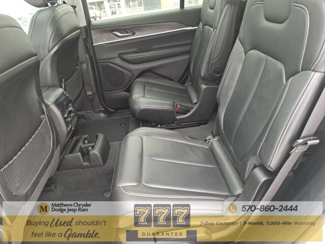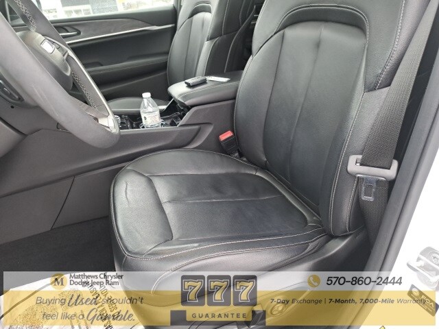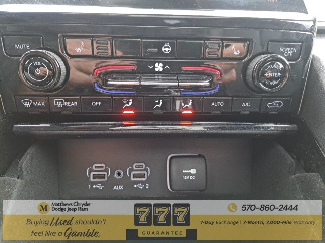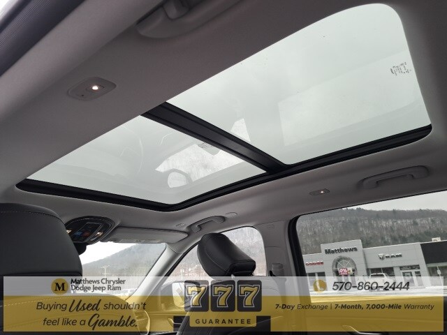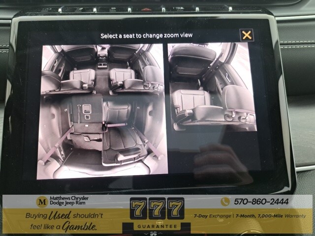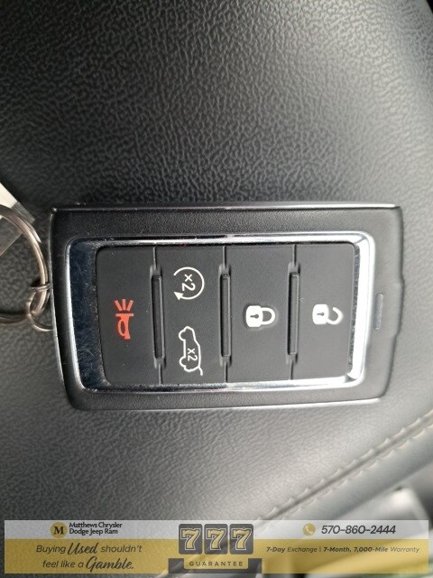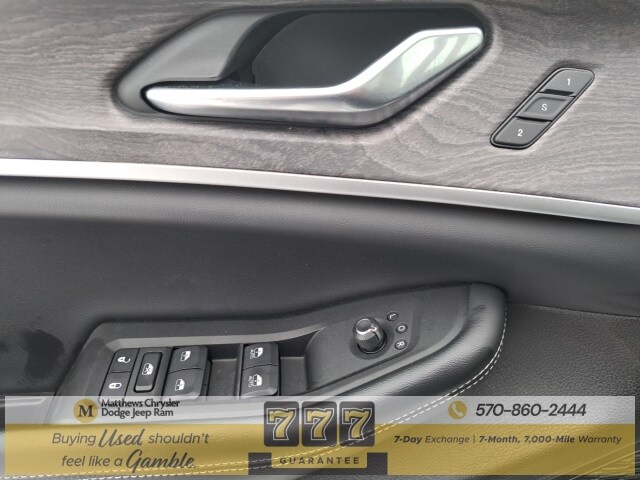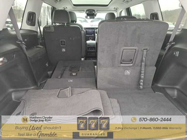 Well Equipped with: Black Appearance Package (Gloss Black Exterior Accents, Molded In Color Black/Gloss Black Roof Rails, and Wheels: 20" x 8.5" Gloss Black Painted Aluminum), Quick Order Package 22E, FCA US LLC Certified Pre-Owned Certified, 3.45 Rear Axle Ratio, 3rd row seats: split-bench, 4-Wheel Disc Brakes, 6 Speakers, ABS brakes, Active Noise Control System, Air Conditioning, Alloy wheels, AM/FM radio: SiriusXM with 360L, Anti-whiplash front head restraints, Audio memory, Auto High-beam Headlights, Automatic temperature control, Brake assist, Bumpers: body-color, Capri Leatherette Seats, Compass, Delay-off headlights, Driver door bin, Driver vanity mirror, Dual front impact airbags, Dual front side impact airbags, Dual-Pane Panoramic Sunroof, Electronic Stability Control, Emergency communication system, Four wheel independent suspension, Front anti-roll bar, Front Bucket Seats, Front Center Armrest w/Storage, Front dual zone A/C, Front fog lights, Front License Plate Bracket, Front reading lights, Fully automatic headlights, Garage door transmitter, Heated door mirrors, Heated front seats, Heated rear seats, Heated steering wheel, Illuminated entry, Interior Rear Facing Camera, Knee airbag, Low tire pressure warning, Manual Fold Seatbacks, Memory seat, Navigation System, Normal Duty Suspension, Occupant sensing airbag, Outside temperature display, Overhead airbag, Overhead console, Panic alarm, ParkView Rear Back-Up Camera, Passenger door bin, Passenger vanity mirror, Power door mirrors, Power driver seat, Power Liftgate, Power passenger seat, Power steering, Power windows, Radio data system, Radio: Uconnect 5 Nav w/10.1" Display, Rear air conditioning, Rear anti-roll bar, Rear reading lights, Rear window defroster, Rear window wiper, Reclining 3rd row seat, Remote keyless entry, Security system, Speed control, Speed-Sensitive Wipers, Split folding rear seat, Spoiler, Steering wheel mounted audio controls, Tachometer, Telescoping steering wheel, Tilt steering wheel, Traction control, Trip computer, Turn signal indicator mirrors, Variably intermittent wipers, Voltmeter, and Wheels: 18" x 8.0" Fully Painted Aluminum.