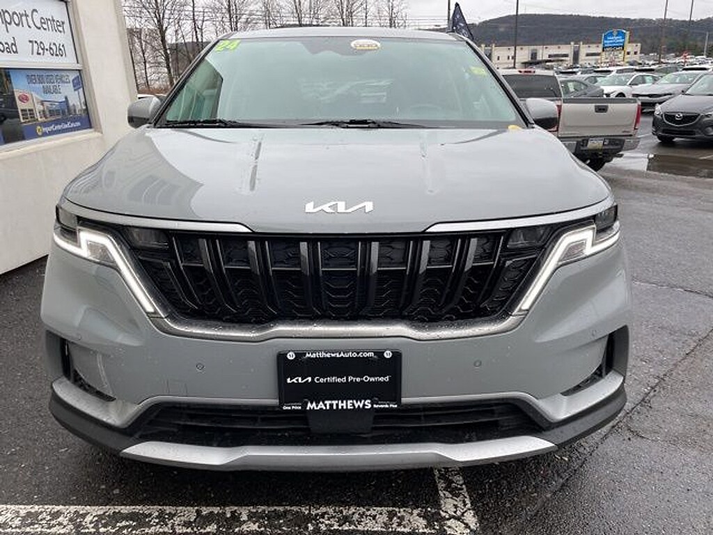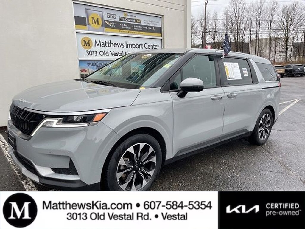 "Matthews Import Center promises each customer a thorough and confident 120-point inspection on our used inventory guaranteeing a relaxing and peace-of-mind experience. We are located behind Lowes in Vestal NY. Or call us at (607) 729 - 6261Matthews Import Center3013 Old Vestal RoadVestal NY 13850. Certified. Ceramic Silver 2024 Kia EX Carnival FWD 8-Speed Automatic V6Odometer is 9086 miles below market average! 19/26 City/Highway MPGKia Certified Pre-Owned Details: * Warranty Deductible: $50 * Powertrain Limited Warranty: 120 Month/100000 Mile (whichever comes first) from original in-service date * 165 Point Inspection * Roadside Assistance * Vehicle History * Limited Warranty: 12 Month/12000 Mile (whichever comes first) ""Platinum Coverage""from certified purchase date * Transferable Warranty * Includes Rental Car and Trip Interruption Reimbursement. 3 month Sirius trial subscription"