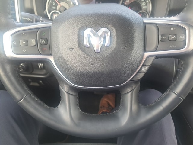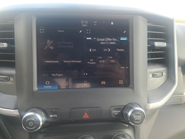Well Equipped with: Big Horn Level 1 Equipment Group (2nd Row In Floor Storage Bins, 4G LTE Wi-Fi Hot Spot, 8.4" Touchscreen Display, Apple CarPlay, Auto-Dimming Exterior Driver Mirror, Auto-Dimming Rear-View Mirror, Black Exterior Mirrors, Black Premium Power Mirrors, Bluetooth Handsfree Phone & Audio, Class IV Receiver Hitch, Cluster 3.5" TFT Color Display, Connectivity - US/Canada, Convex Wide-Angle Mirror Insert, Exterior Mirrors Courtesy Lamps, Exterior Mirrors w/Heating Element, Exterior Mirrors w/Supplemental Signals, For Details, Visit DriveUconnect.com, Global Telematics Box Module (TBM), Glove Box Lamp, Google Android Auto, GPS Antenna Input, Integrated Center Stack Radio, Power 2-Way Driver Lumbar Adjust, Power 8-Way Driver Seat, Power Adjustable Pedals, Power-Folding Mirrors, Radio: Uconnect 5 W w/8.4" Display, Rear Dome w/On/Off Switch Lamp, Rear Power Sliding Window, Rear Window Defroster, SiriusXM Radio Service, SiriusXM Satellite Radio, Sun Visors w/Illuminated Vanity Mirrors, Universal Garage Door Opener, and USB Host Flip), Quick Order Package 27Z Big Horn (Big Horn Badge), FCA US LLC Certified Pre-Owned Certified, 3 Rear Seat Head Restraints, 3.21 Rear Axle Ratio, 4 Way Front Headrests, 4-Wheel Disc Brakes, 48V Belt Starter Generator, 6 Speakers, ABS brakes, Air Conditioning, Alloy wheels, AM/FM radio, Brake assist, Bumpers: chrome, Cloth Bench Seat, Cluster 7.0" TFT Color Display, Compass, Connected Services Delete Credit, Delay-off headlights, Driver door bin, Dual front impact airbags, Dual front side impact airbags, Electronic Stability Control, Emergency communication system: SiriusXM Guardian, Front anti-roll bar, Front Center Armrest w/Storage, Front fog lights, Front License Plate Bracket, Front reading lights, Front Seat Back Map Pockets, Front wheel independent suspension, Fully automatic headlights, Heated door mirrors, Heavy-Duty Engine Cooling, Illuminated entry, Integrated Voice Command w/Bluetooth, Leather steering wheel, Low tire pressure warning, MOPAR Front & Rear Rubber Floor Mats, Occupant sensing airbag, Outside temperature display, Overhead airbag, Overhead console, Panic alarm, ParkView Rear Back-Up Camera, Passenger door bin, Passenger vanity mirror, Power door mirrors, Power steering, Power windows, Radio data system, Radio: Uconnect 3 w/5" Display, Rear 60/40 Folding Seat, Rear anti-roll bar, Rear seat center armrest, Rear step bumper, Remote keyless entry, Speed control, Split folding rear seat, Steering wheel mounted audio controls, Tachometer, Telescoping steering wheel, Tilt steering wheel, Traction control, Trip computer, Variably intermittent wipers, Voltmeter, Wheels: 18" x 8" Cast-Aluminum Painted, and Wheels: 20" x 9" Aluminum Chrome Clad (WRK)