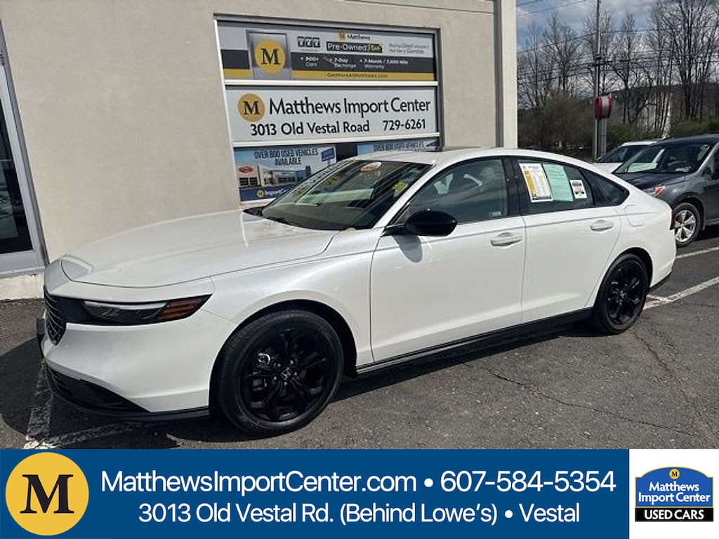 Matthews Import Center promises each customer a thorough and confident 120-point inspection on our used inventory guaranteeing a relaxing and peace-of-mind experience. We are located behind Lowes in Vestal NY. Or call us at (607) 729 - 6261Matthews Import Center3013 Old Vestal RoadVestal NY 13850. White 2025 Honda SE Accord FWD CVT 1.5T I4 DOHC 16V Turbocharged VTEC29/37 City/Highway MPG