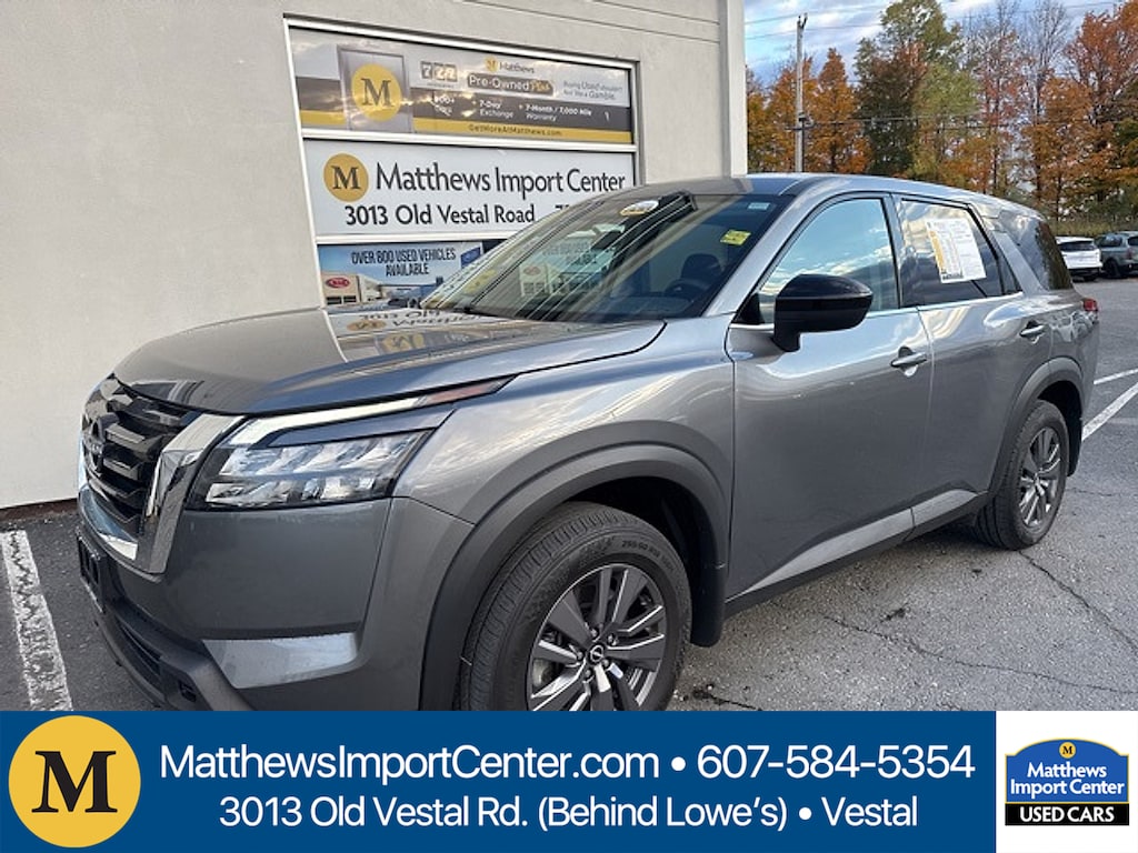 Matthews Import Center promises each customer a thorough and confident 120-point inspection on our used inventory guaranteeing a relaxing and peace-of-mind experience. We are located behind Lowes in Vestal NY. Or call us at (607) 729 - 6261Matthews Import Center3013 Old Vestal RoadVestal NY 13850. Gun Metallic 2024 Nissan S Pathfinder 4WD 9-Speed Automatic 3.5L V6 DOHC21/27 City/Highway MPG